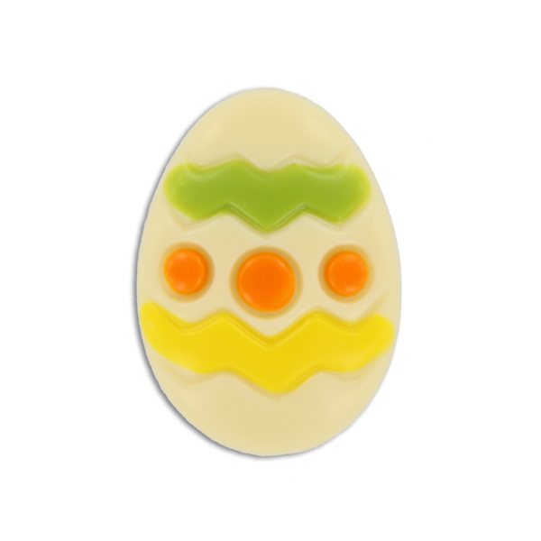 Gekleurd plat paasei, witte melk chocolade, gedecoreerd met gele, oranje en groene chocolade