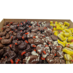 Chocolade lollies van lieve lammetjes, ca 25gr, 16cm per stuk. In een assortiment van witte en melk chocolade